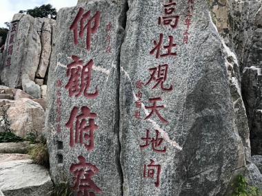“五岳独尊”景观石群,位于泰山极顶玉皇庙东南,海拔1545米。历经百年沧桑的“五岳独尊”四个字是正楷书体,系清光绪丁...