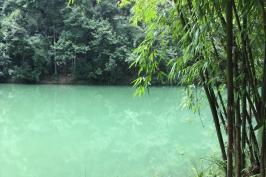 卧龙潭原名翁龙潭,是喀斯特暗河卧龙河的出口处,是小七孔景区一个经典景观,因拦河坝形成的绿水深潭、滚水瀑布及传说的卧龙而得名。暗河从崖底涌出,由于潭边向下处有一道弧弓向内的挡水坝把水拦住,所以潭面犹如镜子般平静,只
