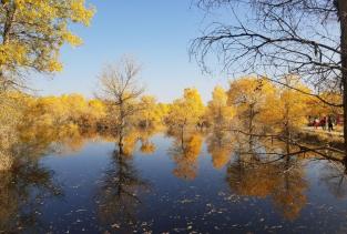 金塔胡杨林,甘肃酒泉的人造胡杨林景区。其特色在于水上倒影,胡杨黄得浓烈,天空蓝的纯粹,水中倒影两种极致色彩辉映,一转眼都是炫目的油画。