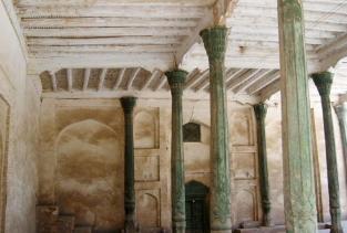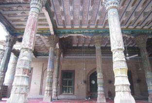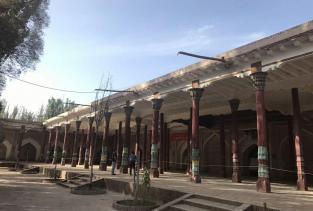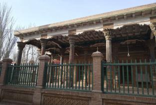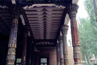 加满清真寺的礼拜室里,三十六根木柱子的雕刻和饰纹各不相同,据说是由三十六个穆斯林信徒捐赠的。拱顶的彩绘以花草为主,没有动物图案,它反映维吾尔人死后是不把动物带走的习俗和重视生命观念。