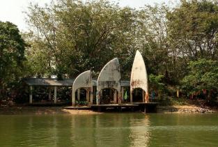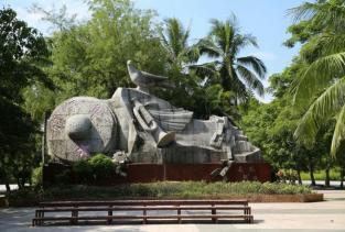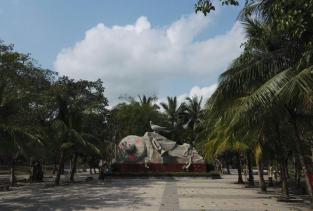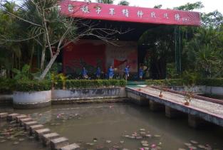 红色娘子军纪念园的舞台背景是女子军竹笠、军号、和平鸽、砸断的锁链的巨型雕塑,内有红色娘子军表演,并有互动,当地的竹杠舞,景区内风景秀丽,人文景观,个人感觉这些都不错,值得一游。