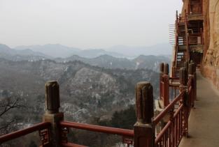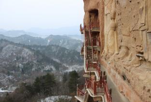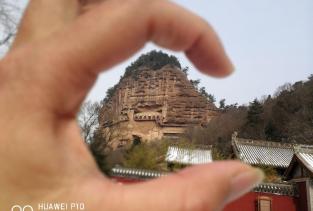 麦积山石窟就像一个大麦垛子,和几大石窟比,虽然开凿时间晚,但这个比较有特点,这个季节人比较少,前些天刚下完雪,从景区门口到石窟有4公里吧,因为雪的原故,景区电瓶车不开,要走到石窟要半小时吧。
