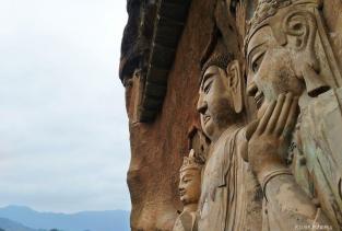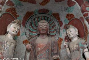 麦积山石窟--中国四大石窟之一 也许是把它放到最后才观,感觉它才是最值得一看的石窟吧.... 1600多年历史变迁,历经灭佛造佛,火灾地震,风雨侵蚀,却保存至今的东方艺术瑰宝。一百多米高的砂砾岩质的山体,四面垂直陡峭的崖壁,在西起的秦岭山脉拱卫中显得有些突兀。它会不会是未知外星文明修建的呢?也有些像农村夏收后的麦垛,所以才叫“麦积山”吧? 这里跟其它三大石窟相比,佛像少了几分庄严肃穆,多了几分温婉与安详,显得温暖而亲近。这里有被称为“东方微笑”的小沙伲憨厚稚气的笑容,更有被誉为“东方蒙娜丽莎”的西魏文皇后
