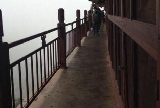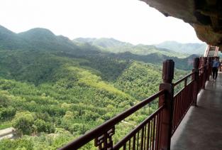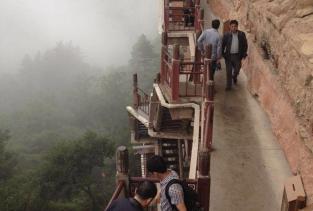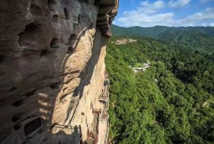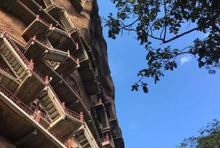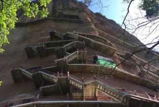 麦积山石窟——四大名窟之一 拥有其他石窟所没有的栈道 高空的楼梯走起来让人也是觉得比较有意思的 从下面往上看的时候也是很壮观 我们今天去的时候 有点小雨 起雾了 不然远眺青山一定更加美丽 上到石窟需要70元 不上就是20 可是要是不上石窟 那20元也没有必要出了