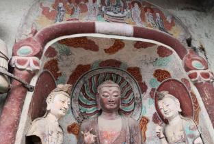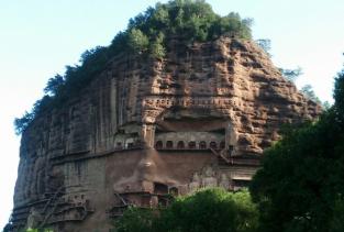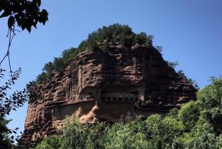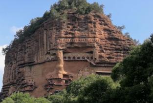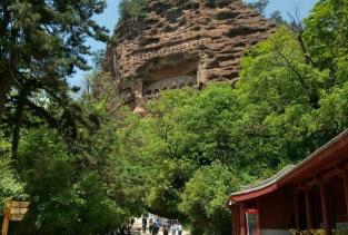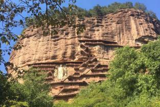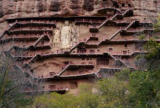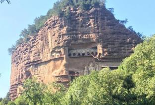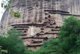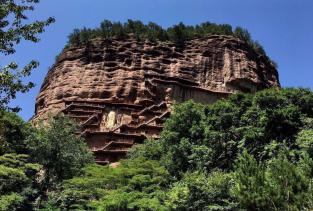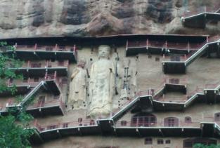 麦积山石窟位于甘肃天水市东南,为一座孤峰山,是南北朝初期西北地区佛教中心。麦积山石窟的修建最早始于后秦 ,并经北魏以后各代陆续修造,成为规模宏大的石窟群。麦积山石窟因山形酷似农家麦垛之状,故名。窟龛凿于高20-80米、宽200米的垂直崖面上。唐开元二十二年(734)大地震,中部洞窟塌毁,使现存洞窟成东、西两崖分布。现存窟龛194个,其中东崖54窟,西崖140窟,泥塑、石胎泥塑、石雕造像7800余尊,最大的造像东崖大佛高15.8米,壁画1000余平方米。麦积山周围风景秀丽,山峦上密布着翠柏苍松,野花茂草。攀