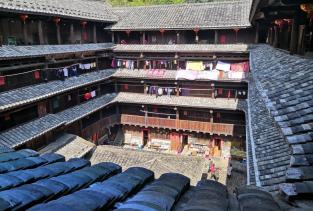 和贵楼又称山脚楼,是南靖最高的土楼。这座土楼建在沼泽地上,用200多根松木打桩、铺垫,历经200多年仍坚固稳定,保存完好,一楼是像小商品市场,二楼以上花5元可以参观。远看已经觉得奇异,走进去更加喜欢。居民们住在围成一圈圈的房间里,天井里的公共区域有小孩在欢快奔跑,妈妈们一边洗菜一边聊天。住惯都市冷漠生疏的鸽子笼,忽然在这里感觉到了亲近与热情。门外青山楼外楼,门外是远方与未知,门内是生活与温情。